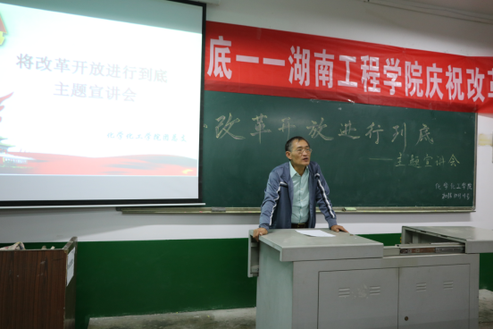 为了庆祝改革开放40周年,10月11日晚上7点,化学化工学院于四教209举行“将改革开放进行到底”主题宣讲会。本次宣讲会,由张建国副书记主讲,化学化工学院全体学生党员、预备党员以及学生干部到场,聆听了本次宣讲。