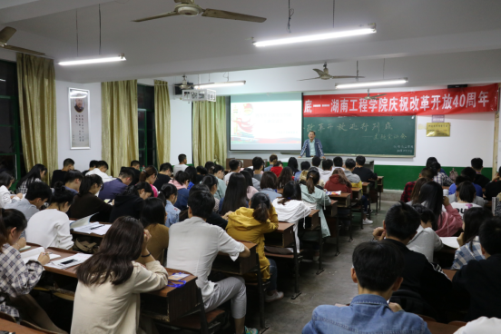 宣讲会伊始,张建国从自己的亲身经历讲起,向同学们讲述改革开放以来自己的亲身感受,让同学们深刻体会到改革开放之前群众生活的困苦,以及改革开放后民众生活水平的显著提高。之后,张建国又向同学们详细讲解了什么是改革开放,以及改革开放取所得的卓越成就,加深了同学们对改革开放的认识。最后,张建国为同学们播放了关于改革开放的宣传片,长达四十几分钟的宣传片介绍了改革开放以来,中国的种种改变,也更加坚定了同学们将改革开放进行到底的决心。