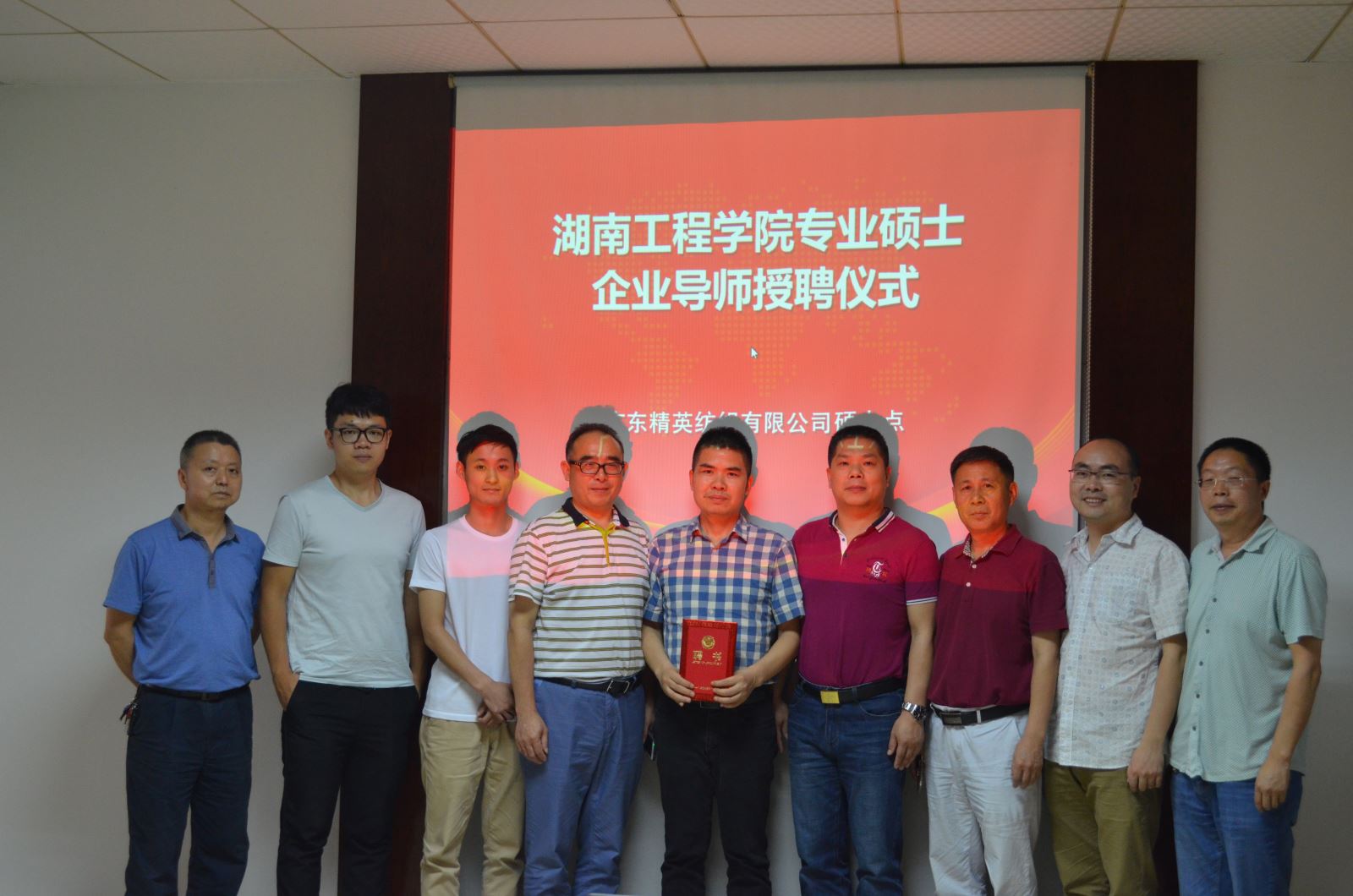 2017年5月19日,受学校委托,化学化工学院院长邓继勇、书记胡爱钦、轻化工程教研室主任陈镇及硕士生导师翦育林教授一行四人来到广东肇庆,代表365英国上市官网在线研究生处向我校87届优秀校友——现广东精英纺织有限公司董事长彭太平先生颁发硕士导师聘书,正式聘请彭太平为我校纺织工程专业硕士研究生企业导师。